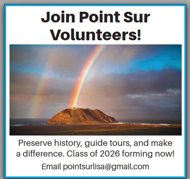 Pt. Sur lighthouse and its supporting lightstation buildings, now a California State Historic Park, stand atop a dramatic volcanic rock just off-shore in Big Sur, California. This historic aid-to-navigation has a modern aero-beacon which still guides ships along the treacherous Central California Coast. On the National Register of Historic Places and a California landmark, Pt. Sur can be visited by guided walking tours year round.