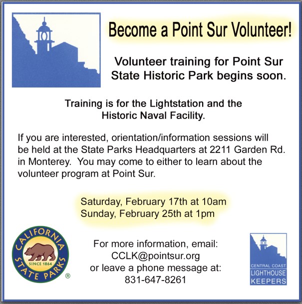 All Lighthouse and NavFac Tours are canceled for Saturday May 17th due to scheduled Highway 1 closure.